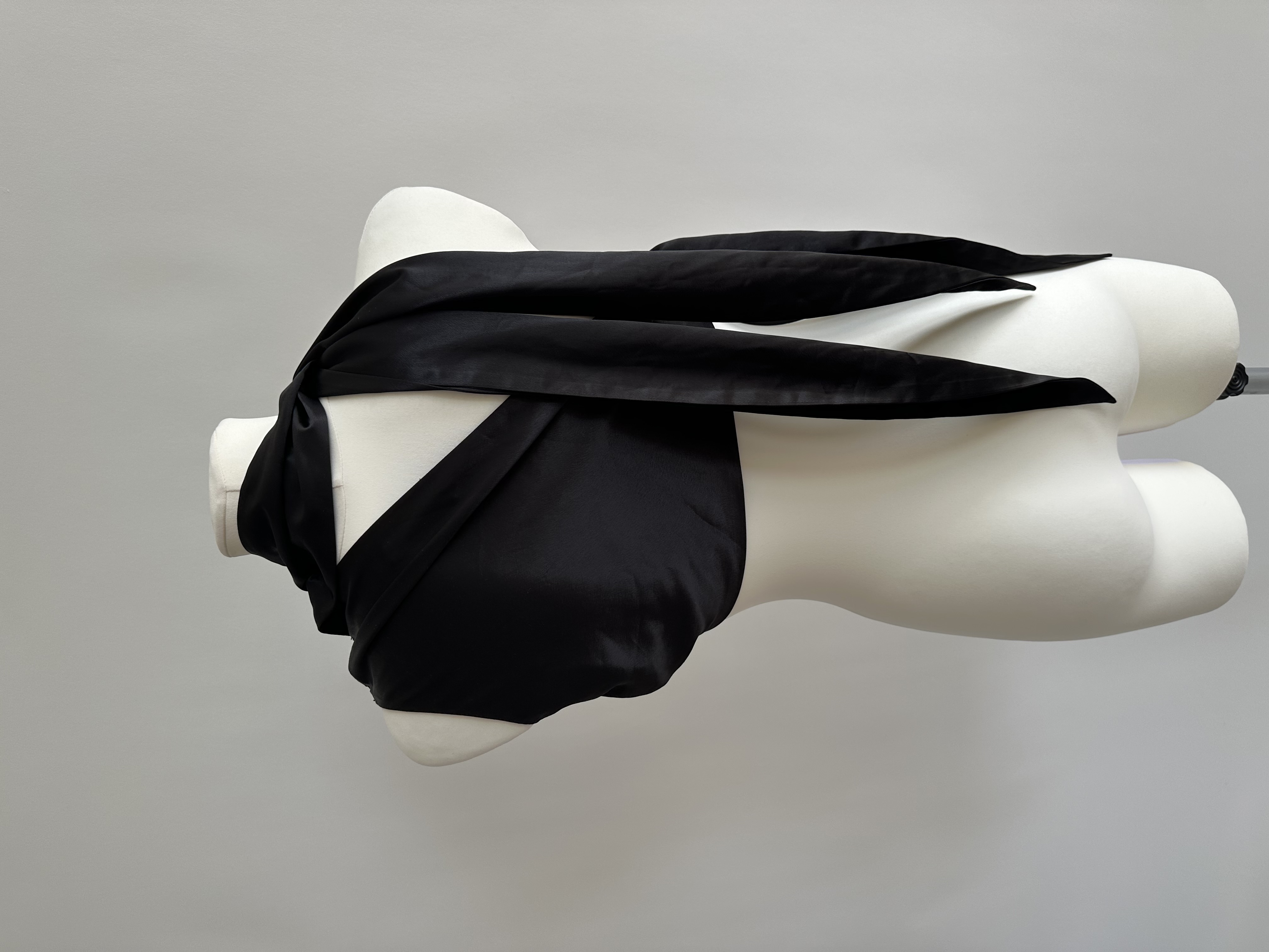 Black satin crop top features a unique wrap design that drapes elegantly around the neck and across the body.