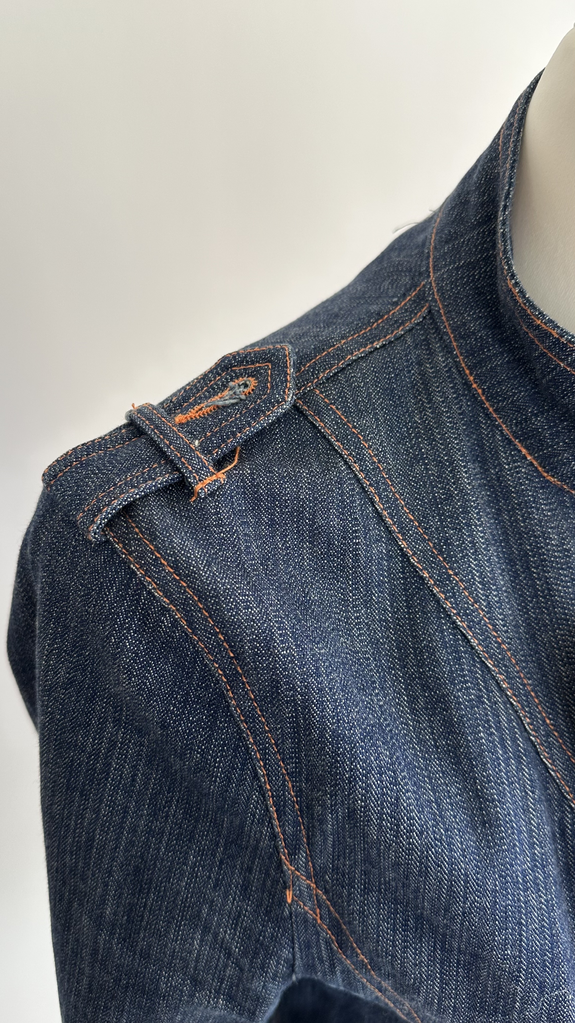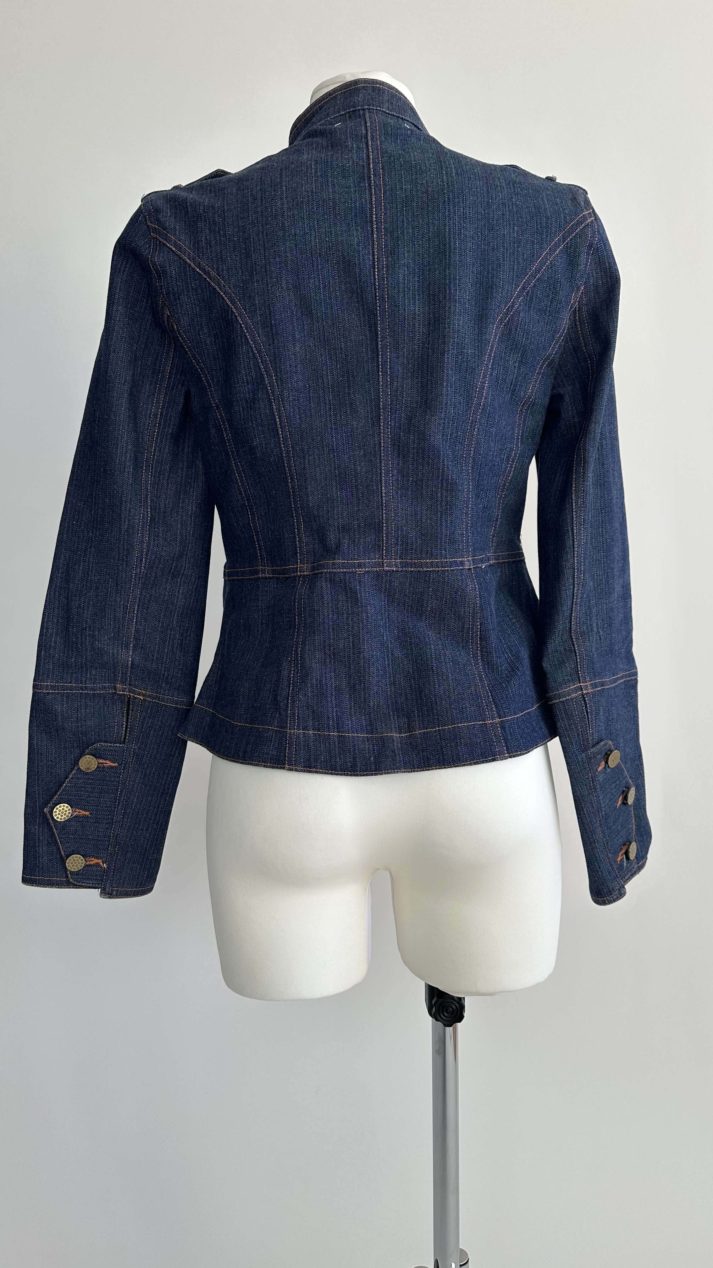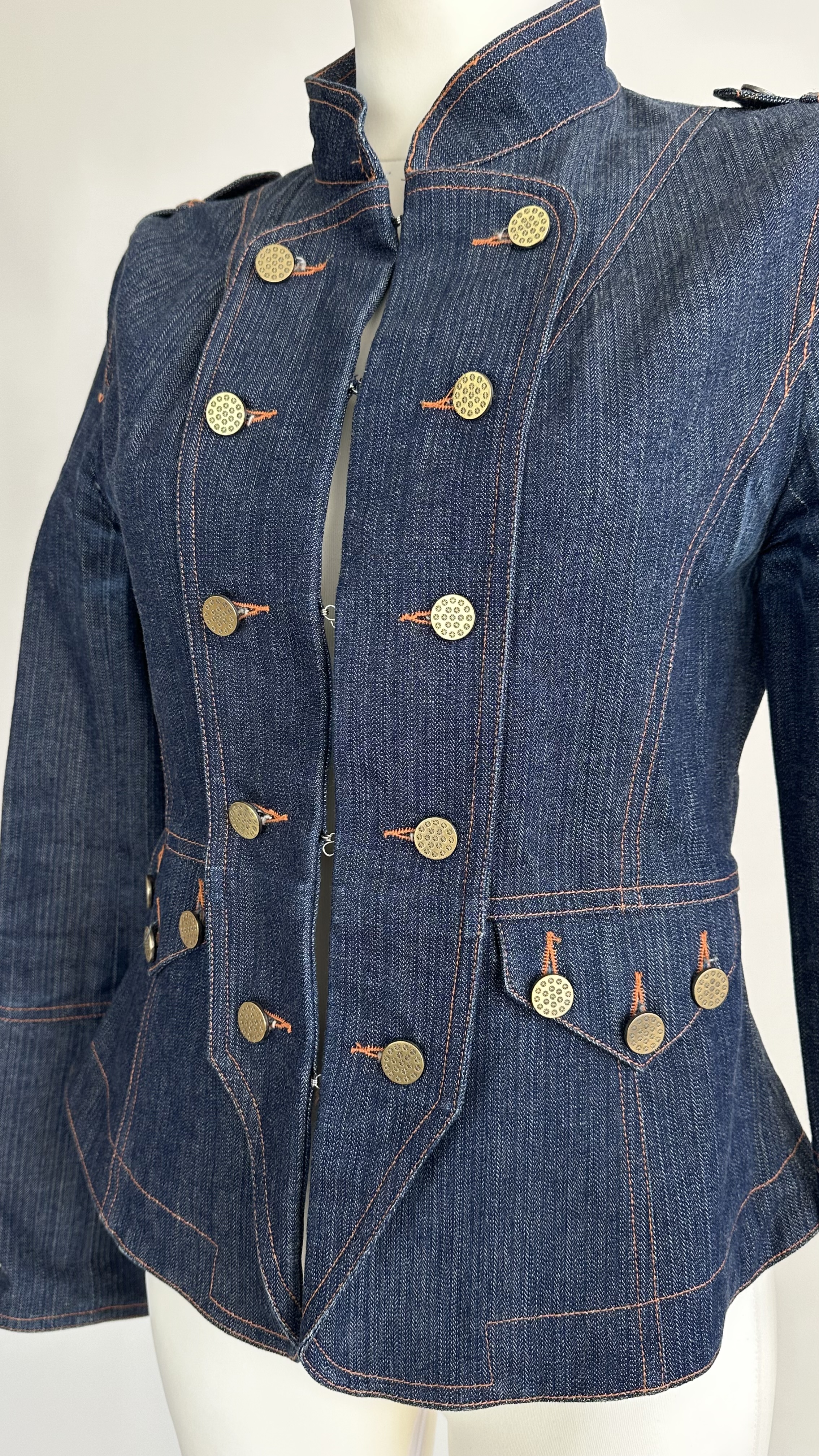 Structured Napoleon jacket made from dark blue denim with a fitted, feminine silhouette. Features a stand-up collar, decorative metal buttons, contrast stitching, and classic military-inspired details including shoulder tabs and waist shaping.