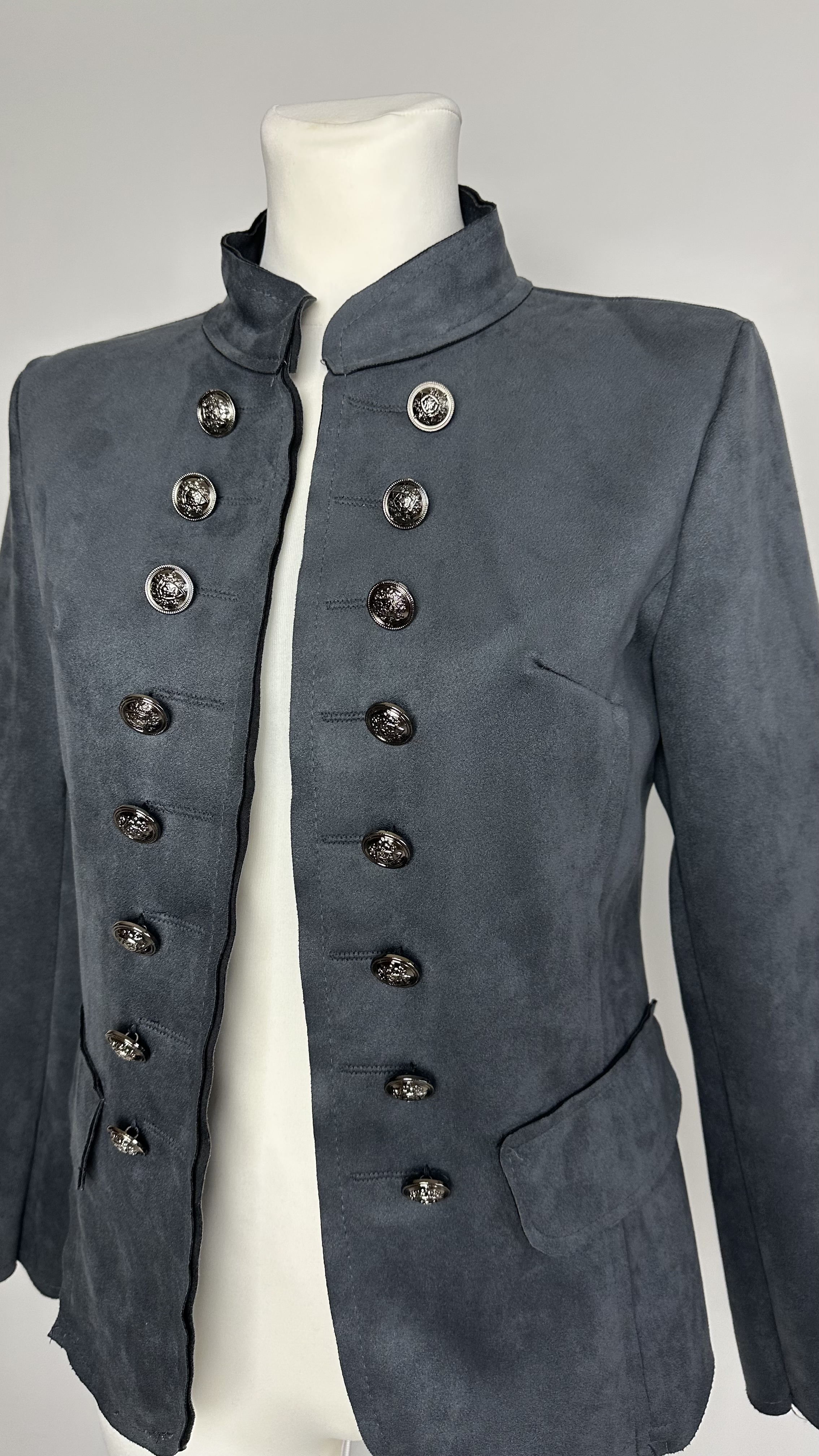 A refined Napoleon jacket with a clean, structured silhouette and timeless military inspiration. This piece features a fitted cut that shapes the waist while maintaining sharp lines through the shoulders and sleeves. The double rows of decorative metal buttons and stand collar are classic elements of the Napoleon jacket style, giving it a strong yet elegant presence.