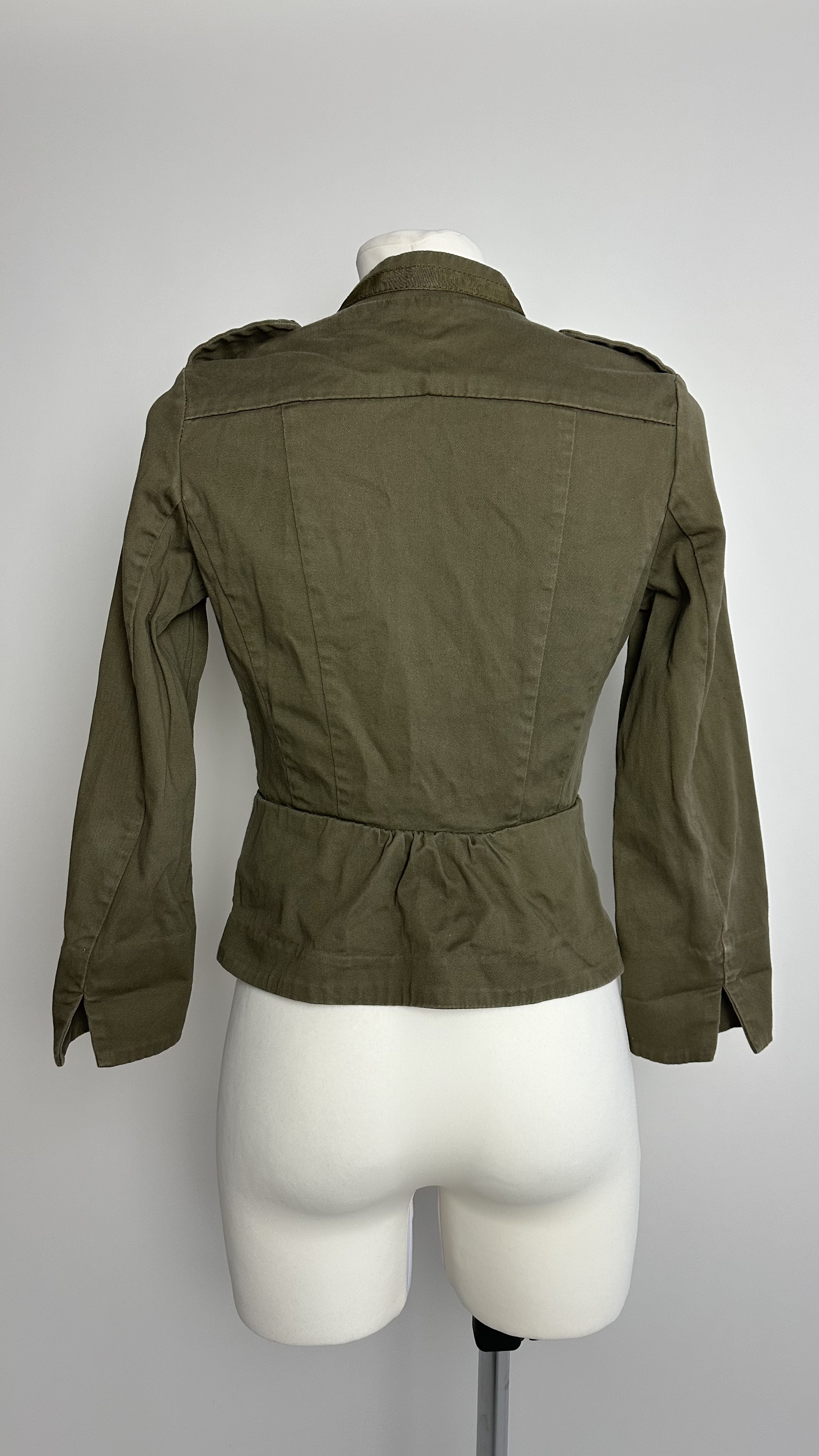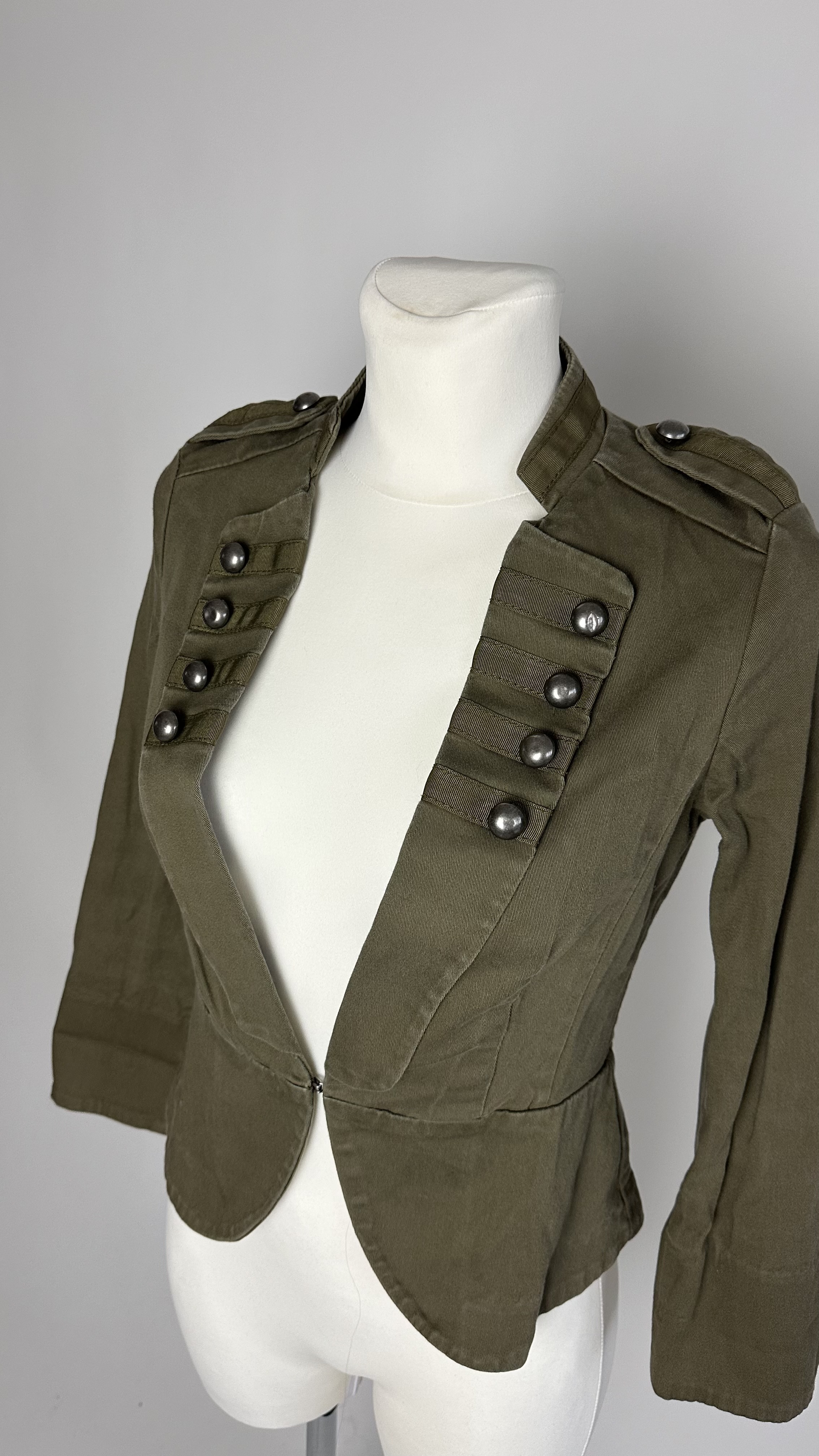 A classic Napoleon jacket with a feminine, fitted silhouette and strong military character. This khaki piece by H&M features structured shoulders, a defined waistline, and signature decorative metal buttons that frame the front. The stand collar and tailored seams enhance the sharp, uniform-inspired look while keeping it wearable and versatile.