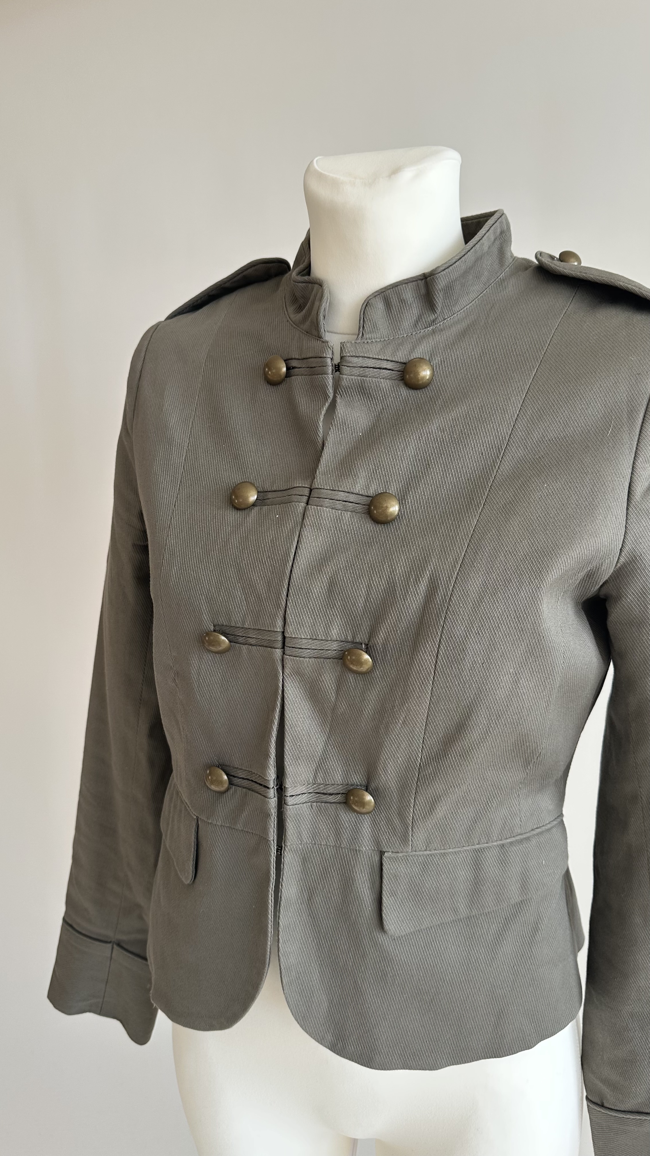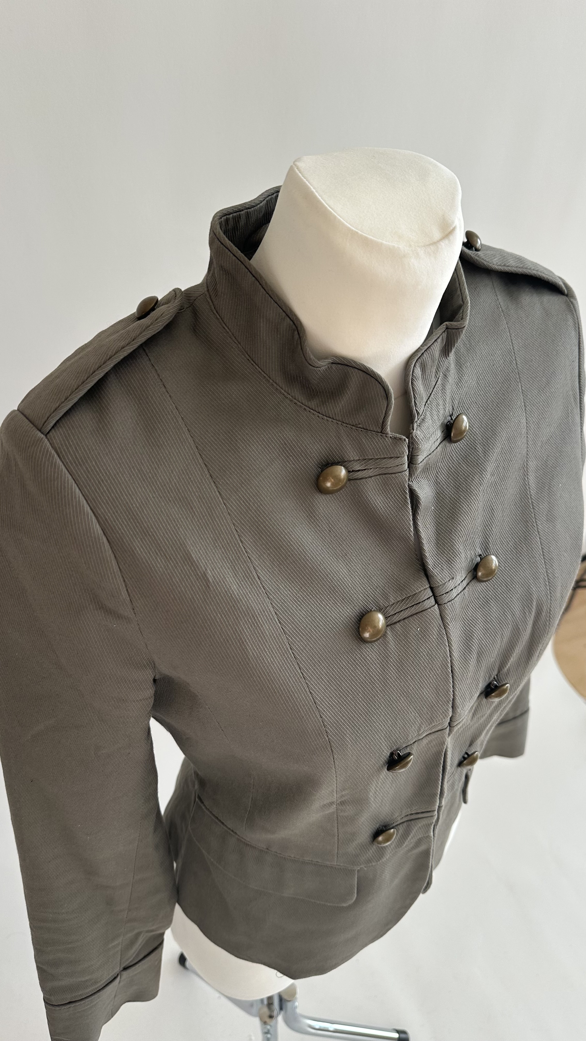 A classic Napoleon jacket by H&M, defined by clean military tailoring and a structured, feminine silhouette. This khaki jacket features a stand collar, decorative metal buttons, and subtle shoulder epaulettes — signature elements of the Napoleon jacket style. The fitted cut shapes the waist while keeping the overall look sharp and balanced.