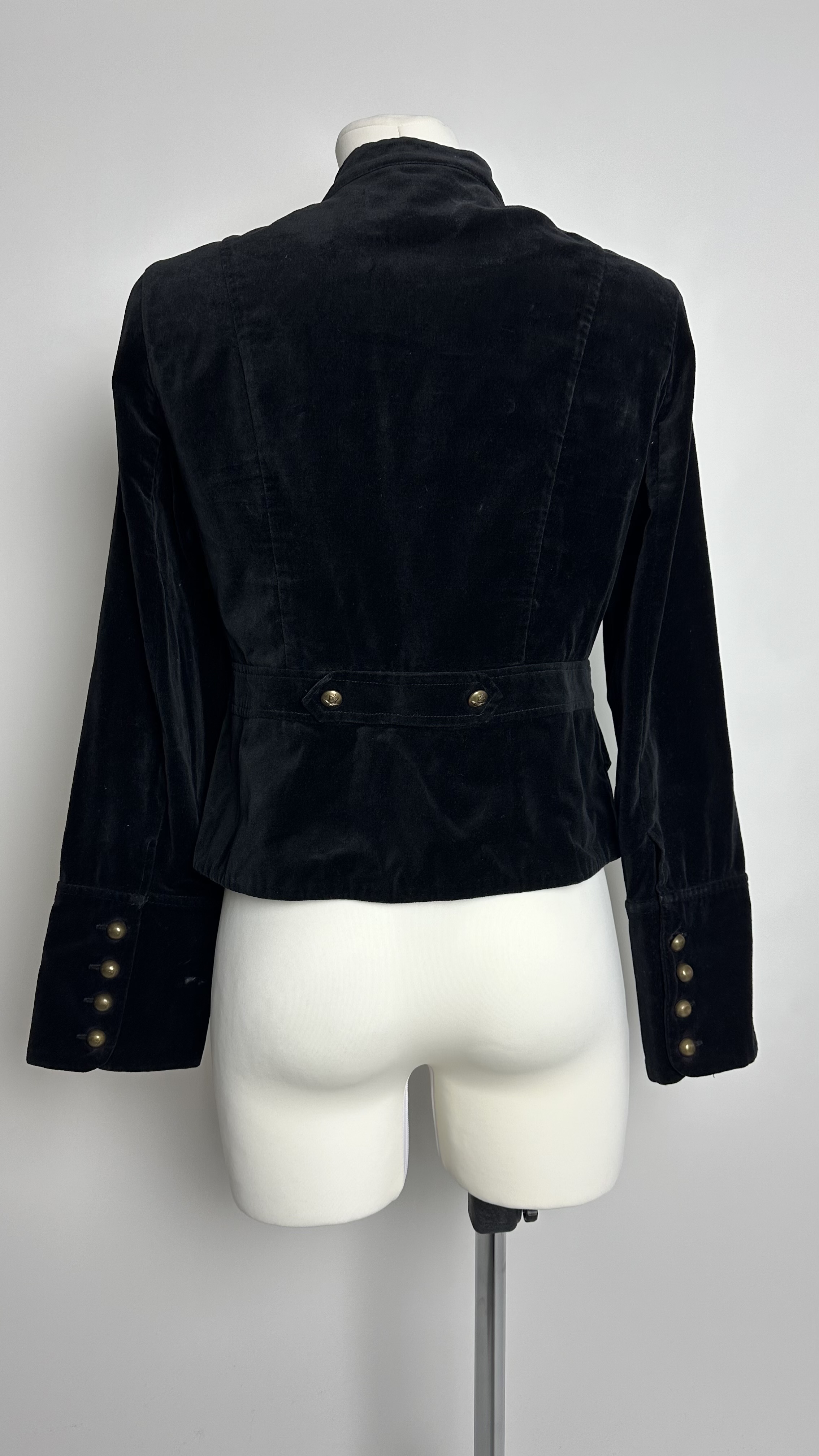 Elegant black Napoleon-style jacket with a structured military silhouette. Made from soft velvet with a subtle sheen, featuring a stand collar, decorative brass-tone buttons on the front and cuffs, and a fitted waist that beautifully shapes the figure. A timeless, slightly dramatic piece that works perfectly with jeans, tailored trousers, or a skirt.