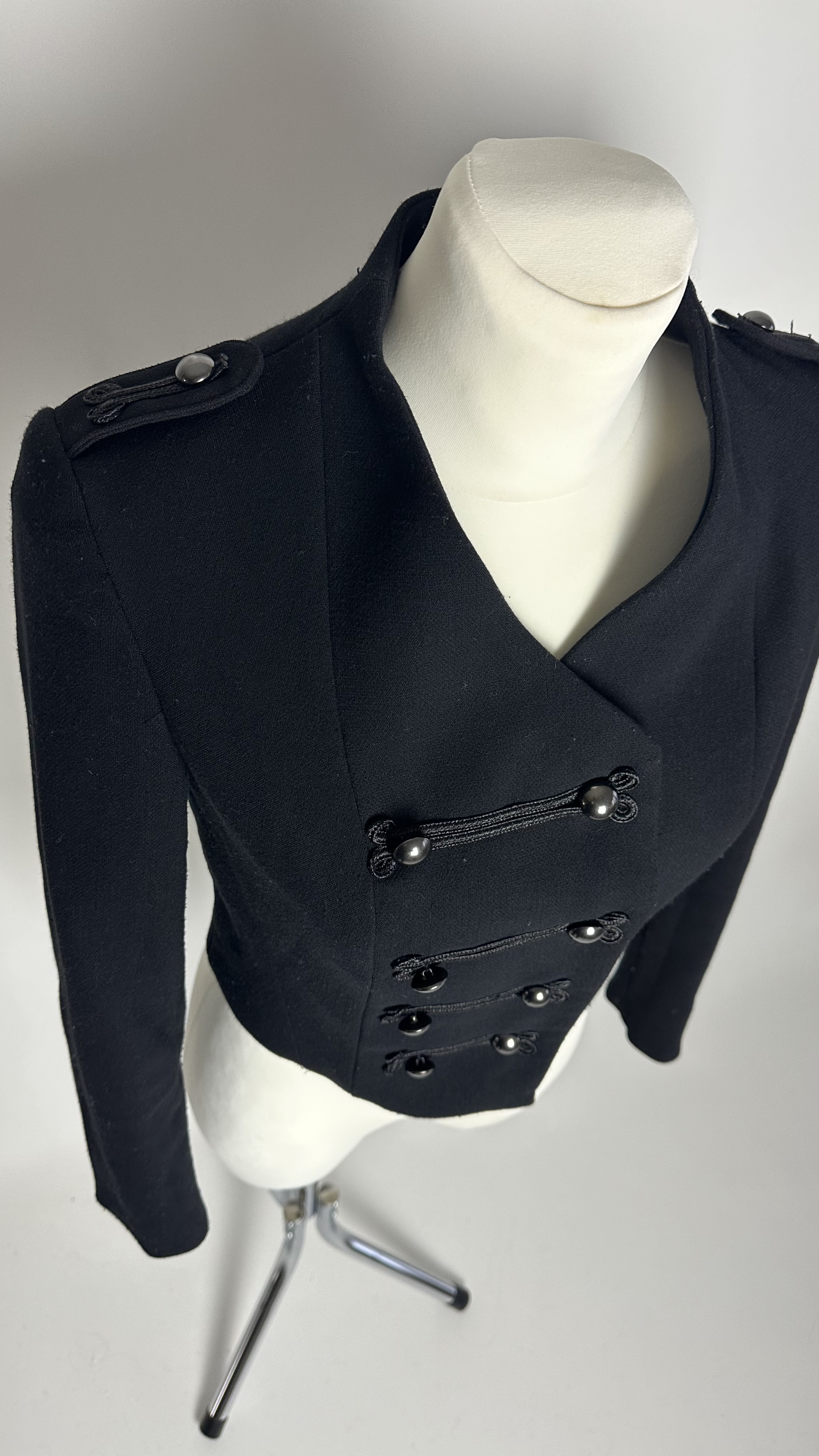 A refined, military-inspired Napoleon jacket in EU size 36 (S) with a clean, cropped silhouette. Designed with a sharp V-shaped neckline, decorative horizontal fastenings with buttons, and a structured cut that highlights the waist while keeping the overall look elegant and minimal.