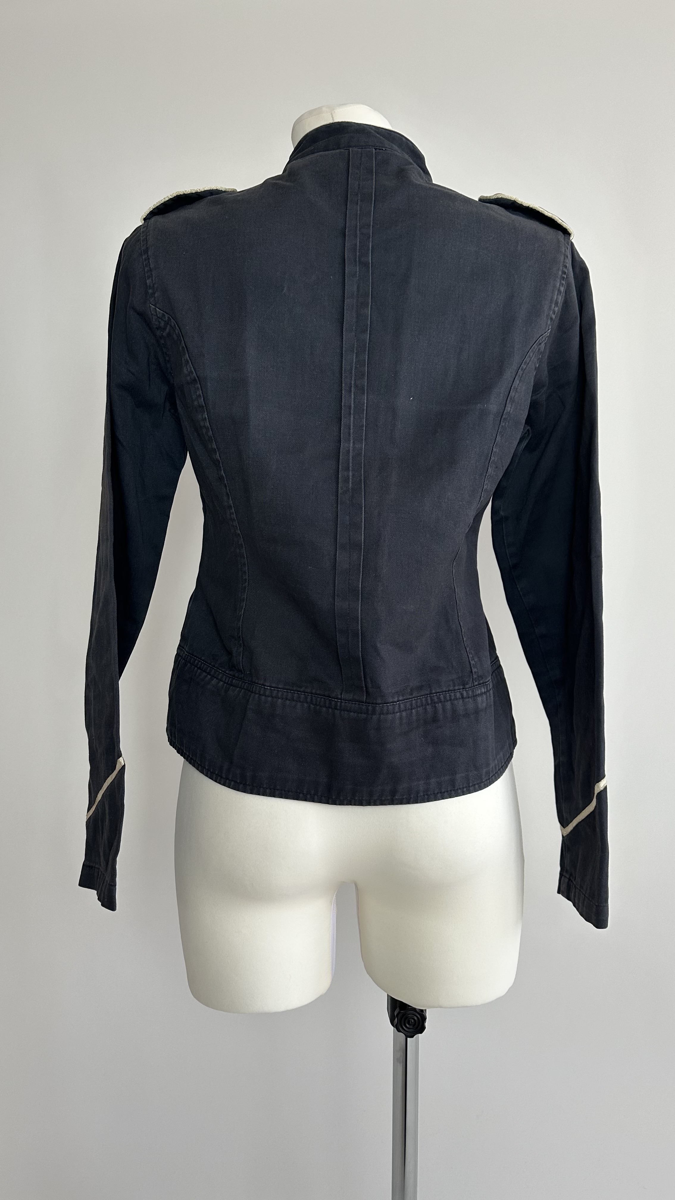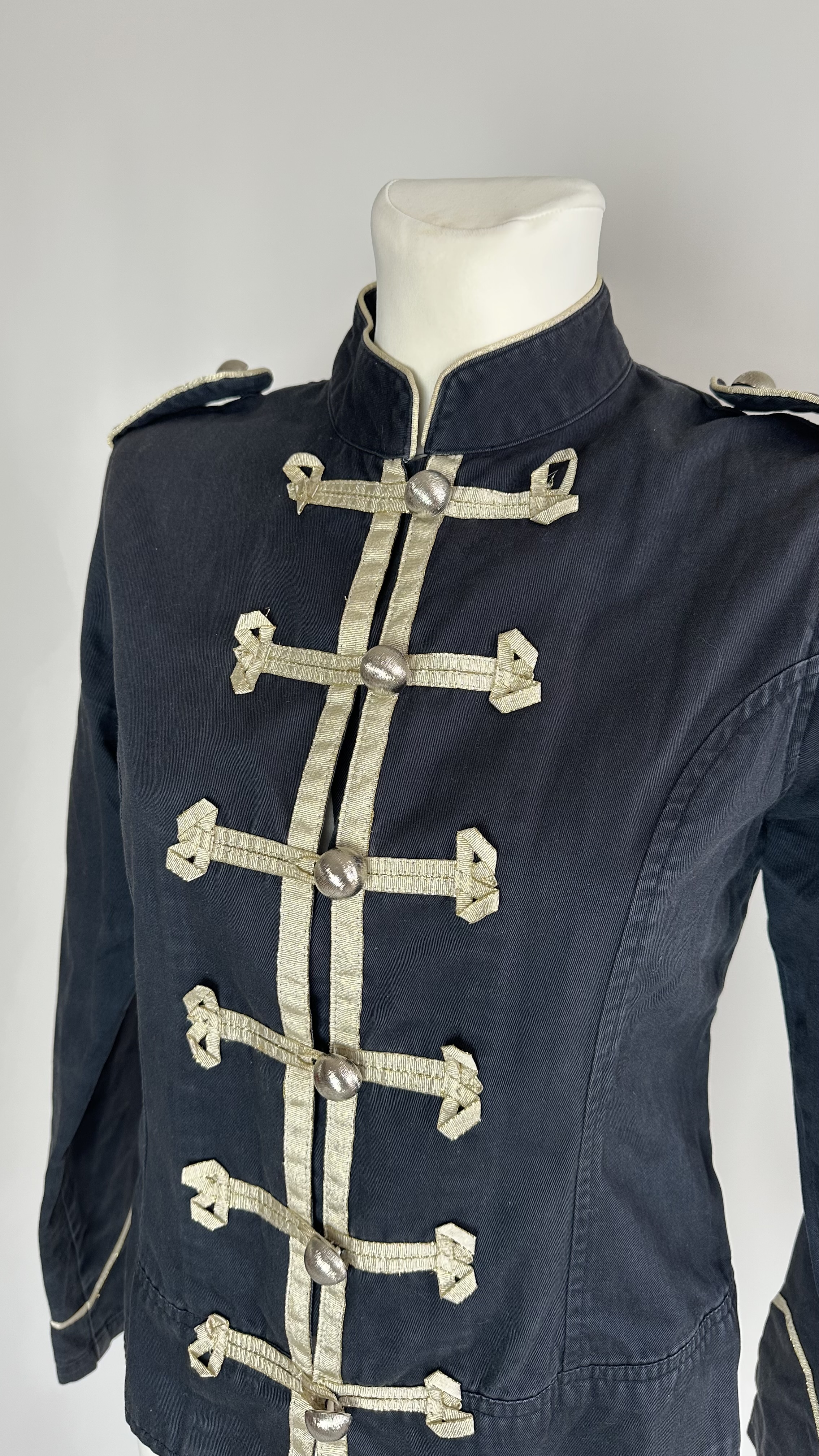 A striking, military-inspired Napoleon jacket in size M with a strong yet elegant silhouette. Designed with a high stand collar, contrasting decorative braiding, and statement metallic buttons that define its classic military character. The tailored cut follows the body beautifully while maintaining structure and comfort.