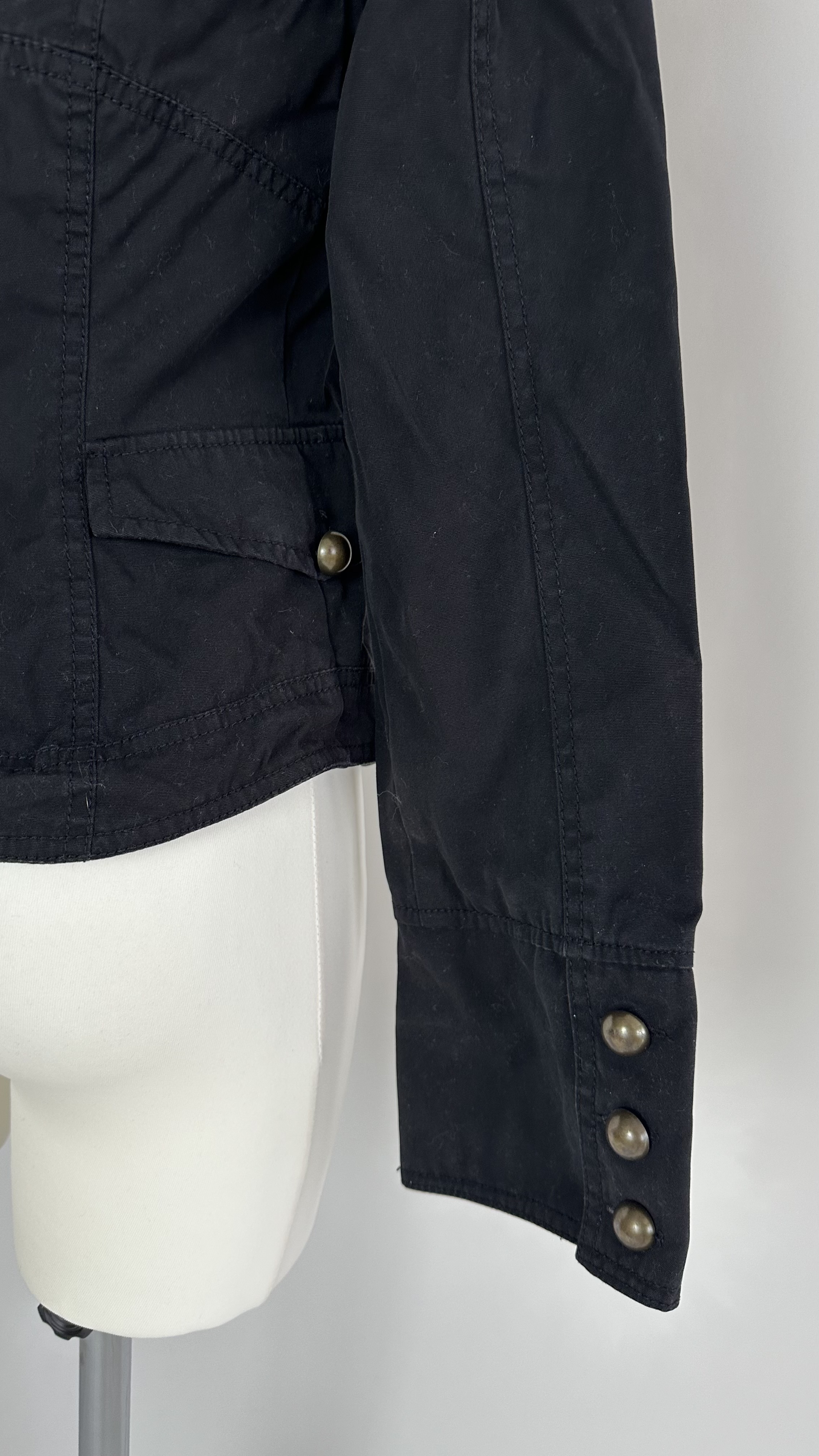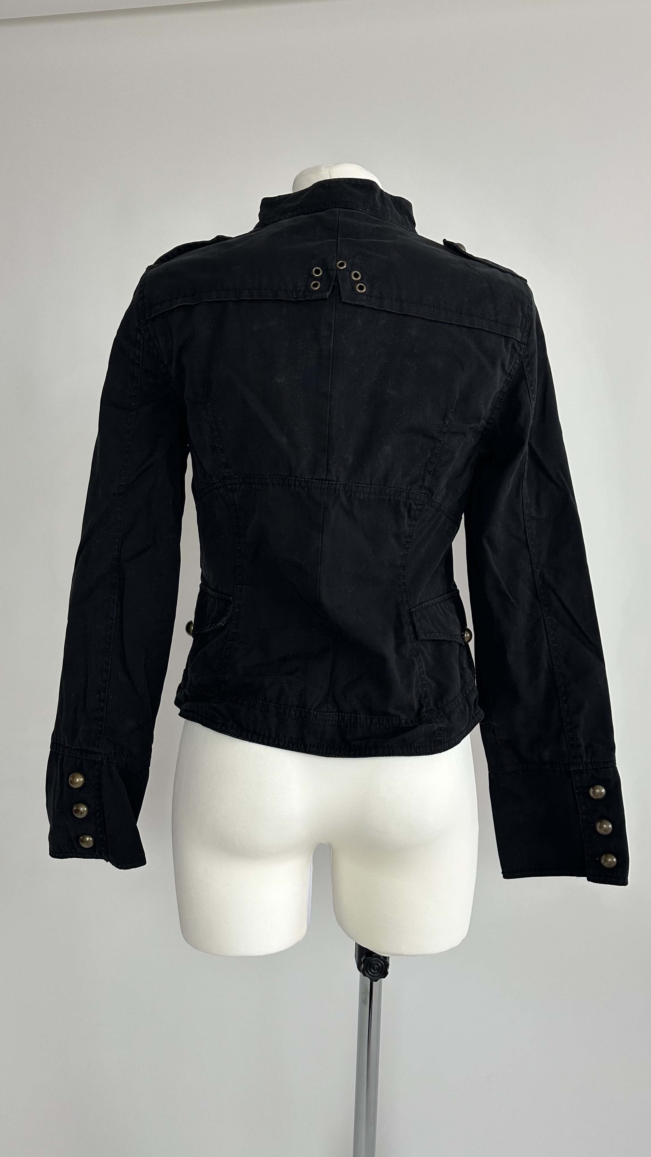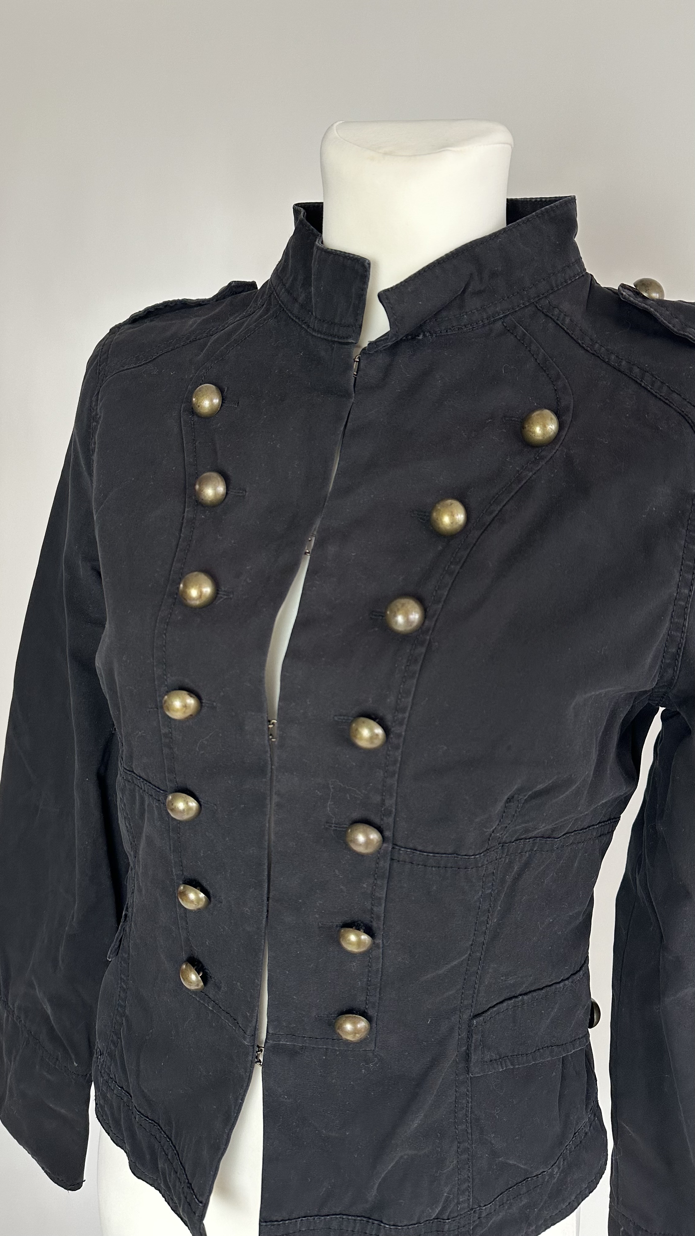 A classic, military-inspired Napoleon jacket in size S with a clean, structured silhouette. Designed with a high stand collar, double rows of decorative metal buttons, and a tailored cut that highlights the waist while maintaining a sharp, confident shape. The slightly worn black finish adds character and a subtle vintage feel.