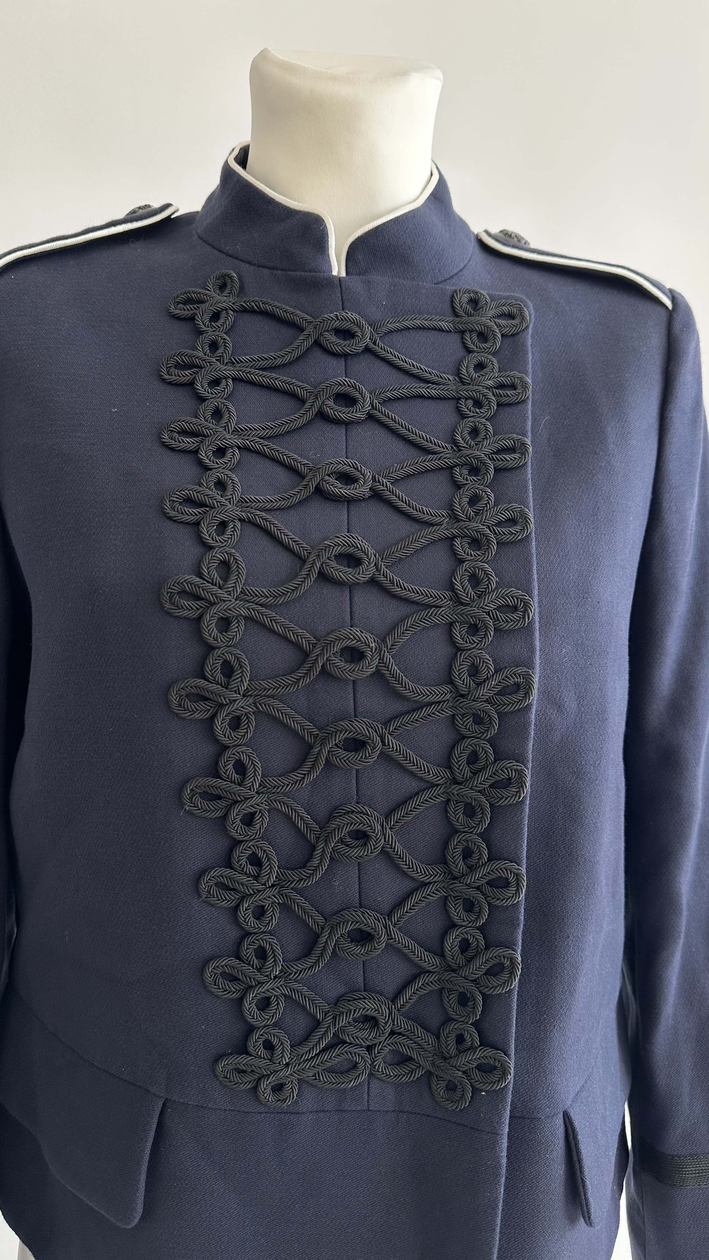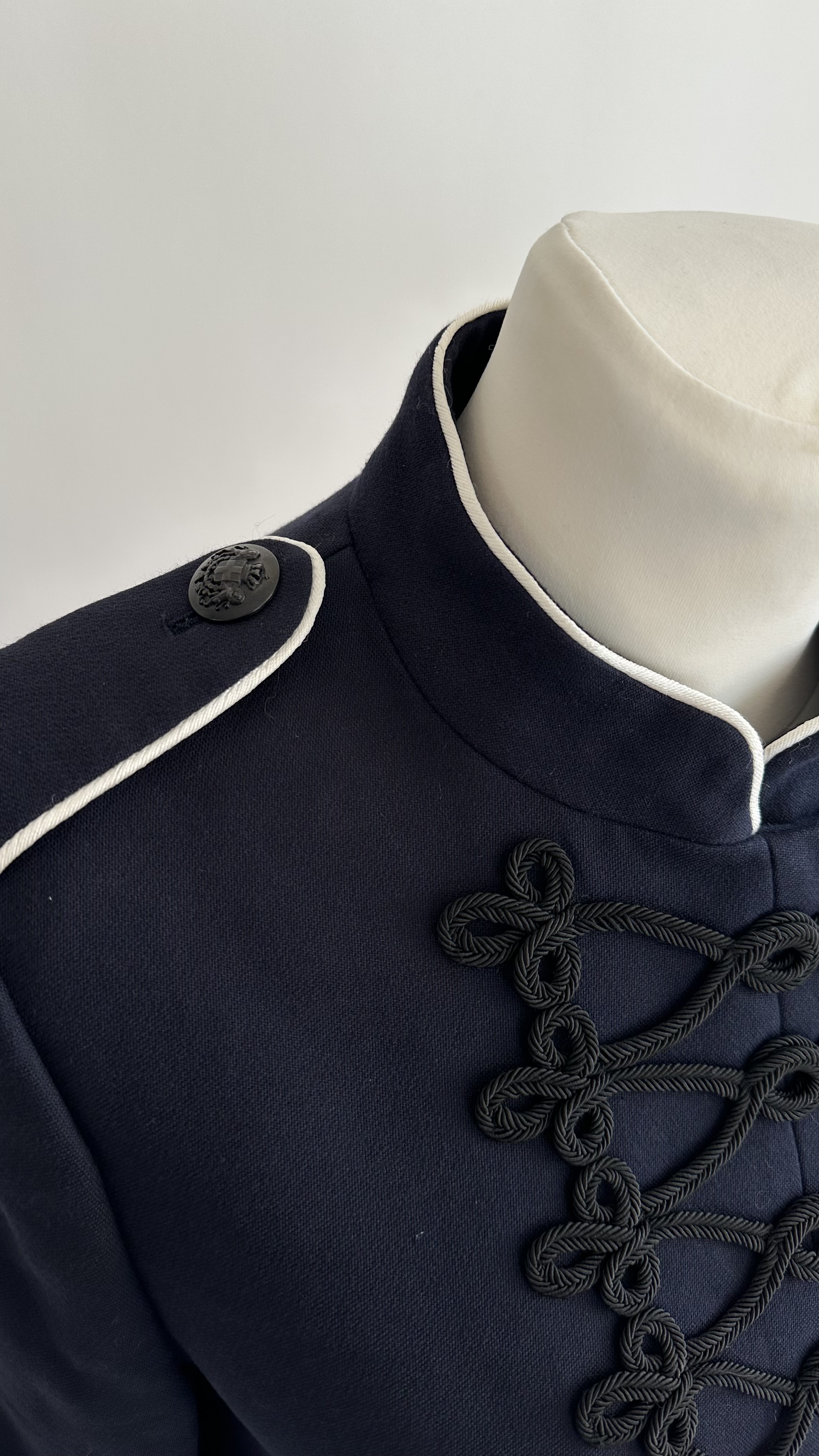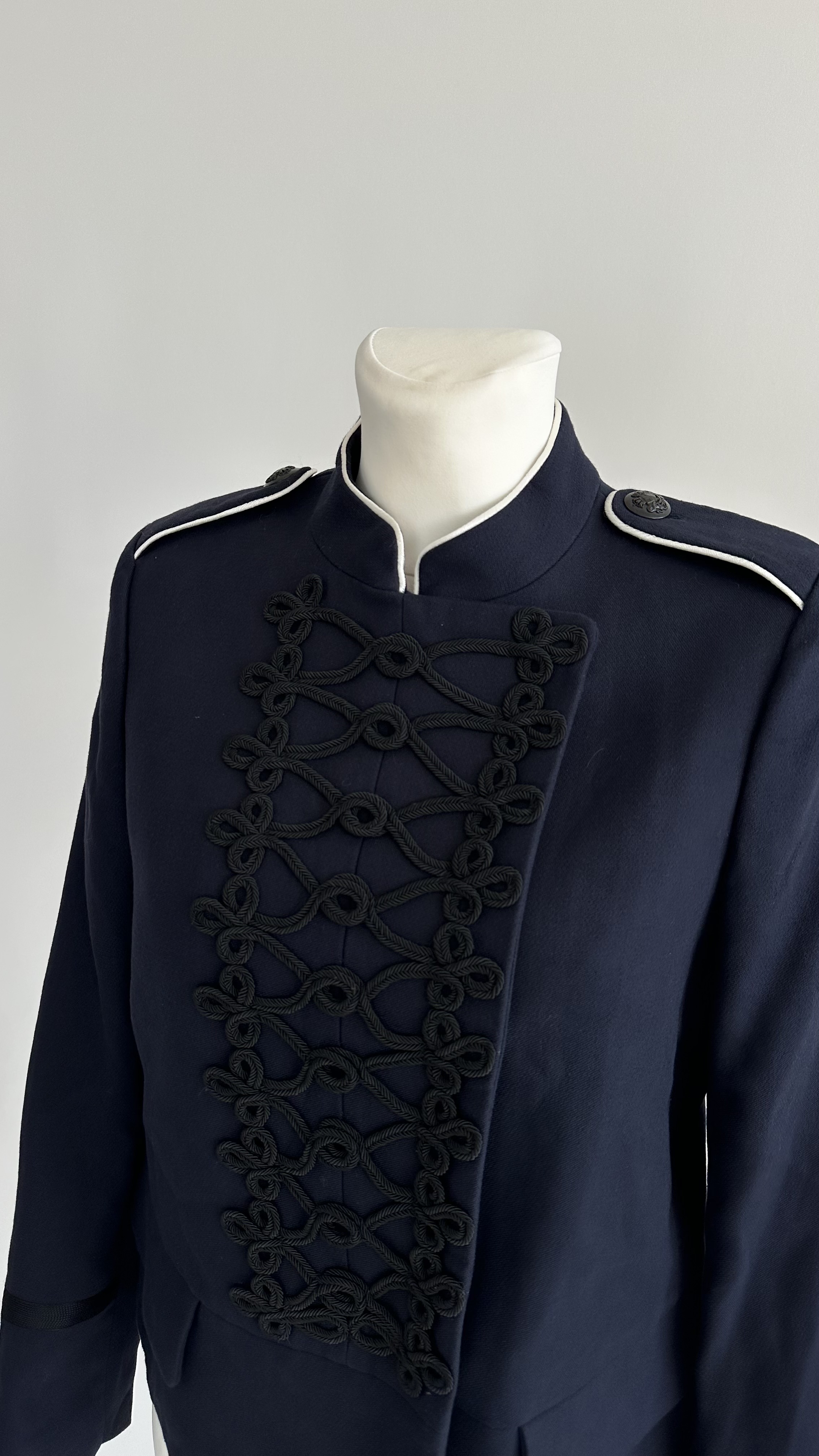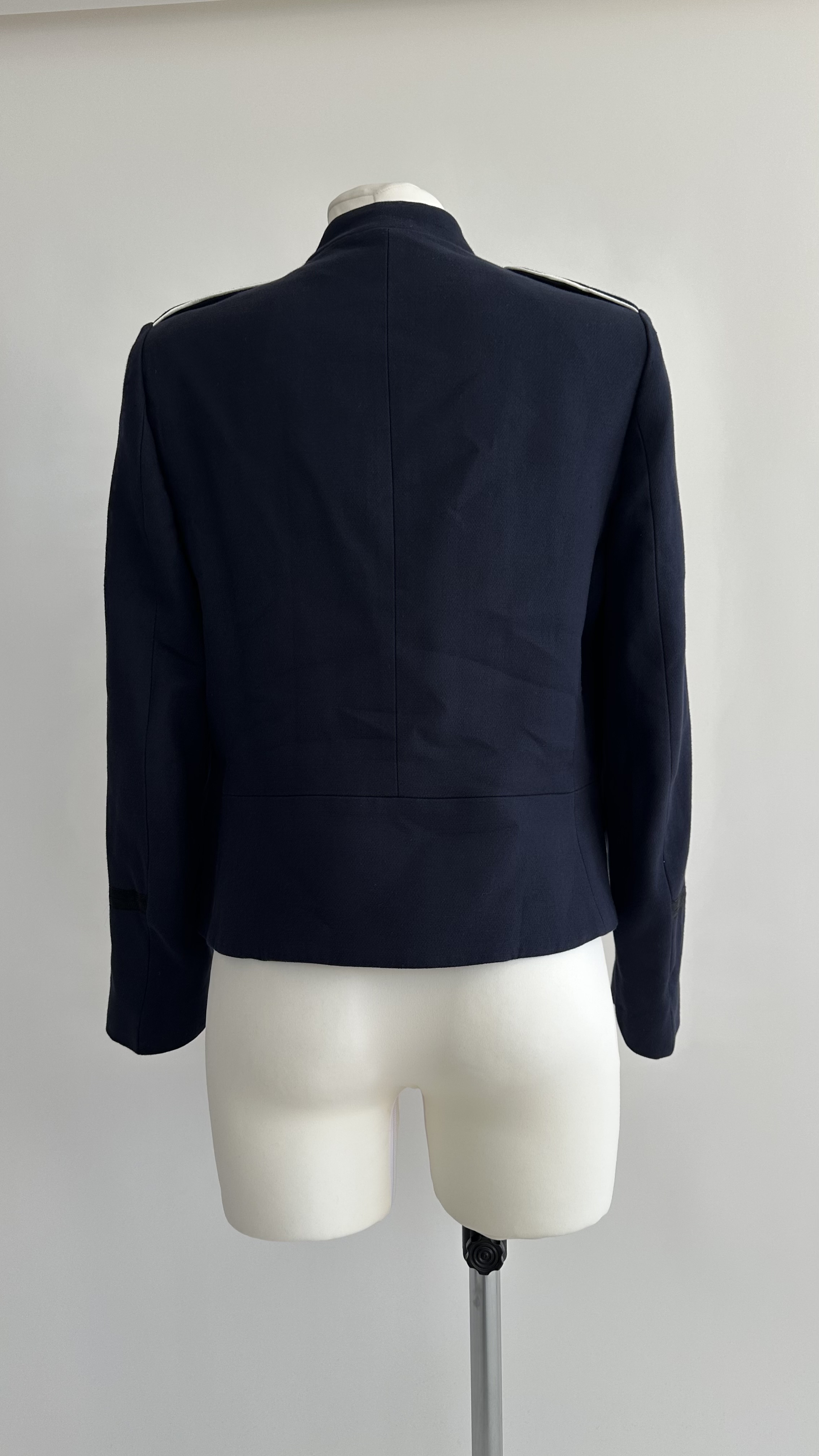 A refined, military-inspired Napoleon jacket in size S by Mango, featuring a clean, structured silhouette with a modern, elegant twist. Designed with a high stand collar accented by contrast piping, intricate braided detailing across the front, and a tailored cut that gives the jacket a sharp yet feminine shape.