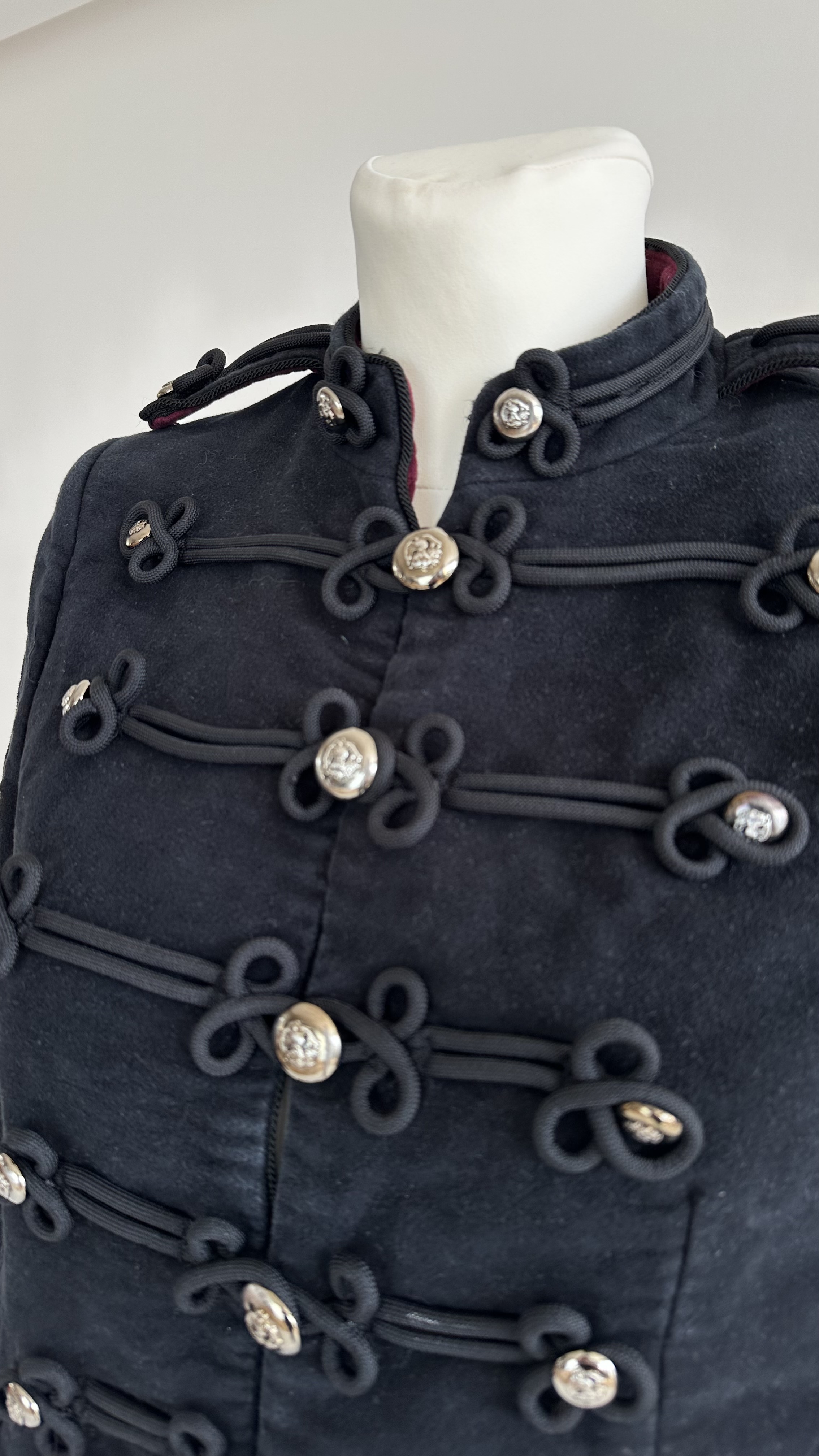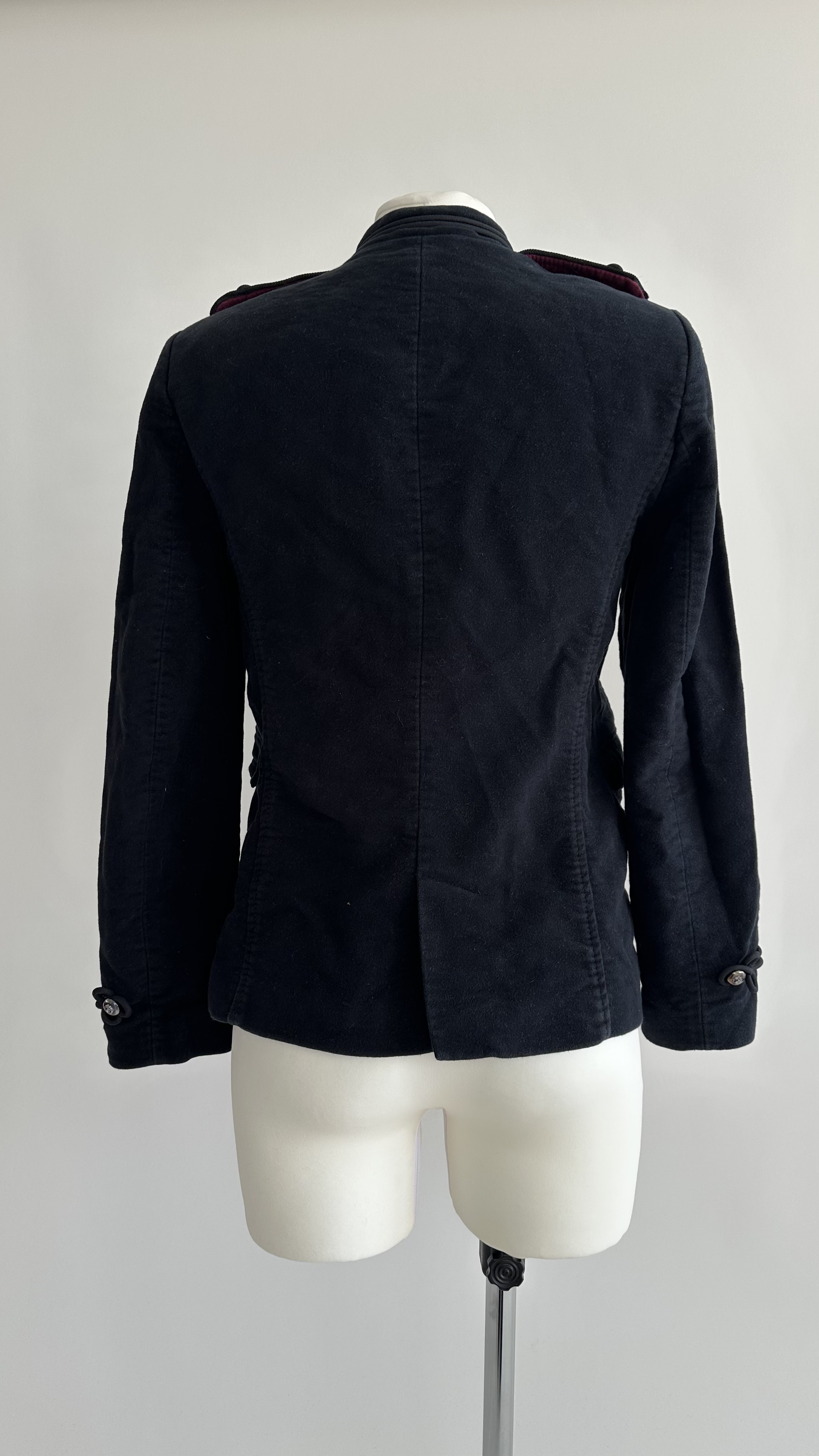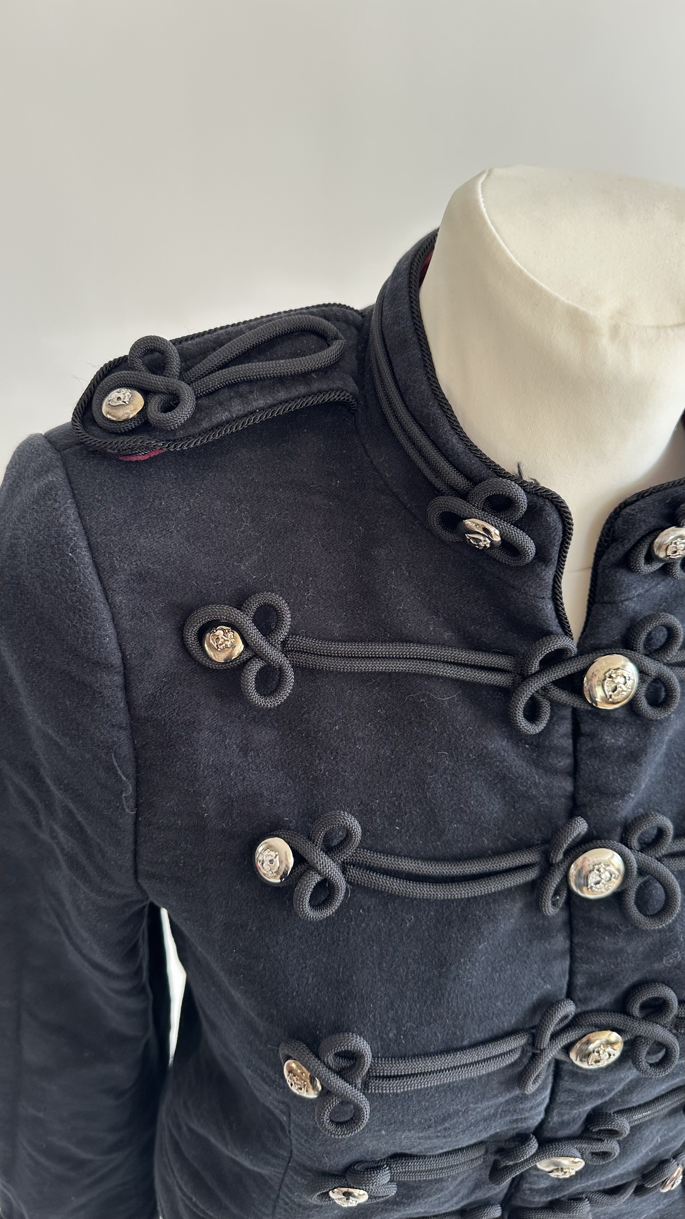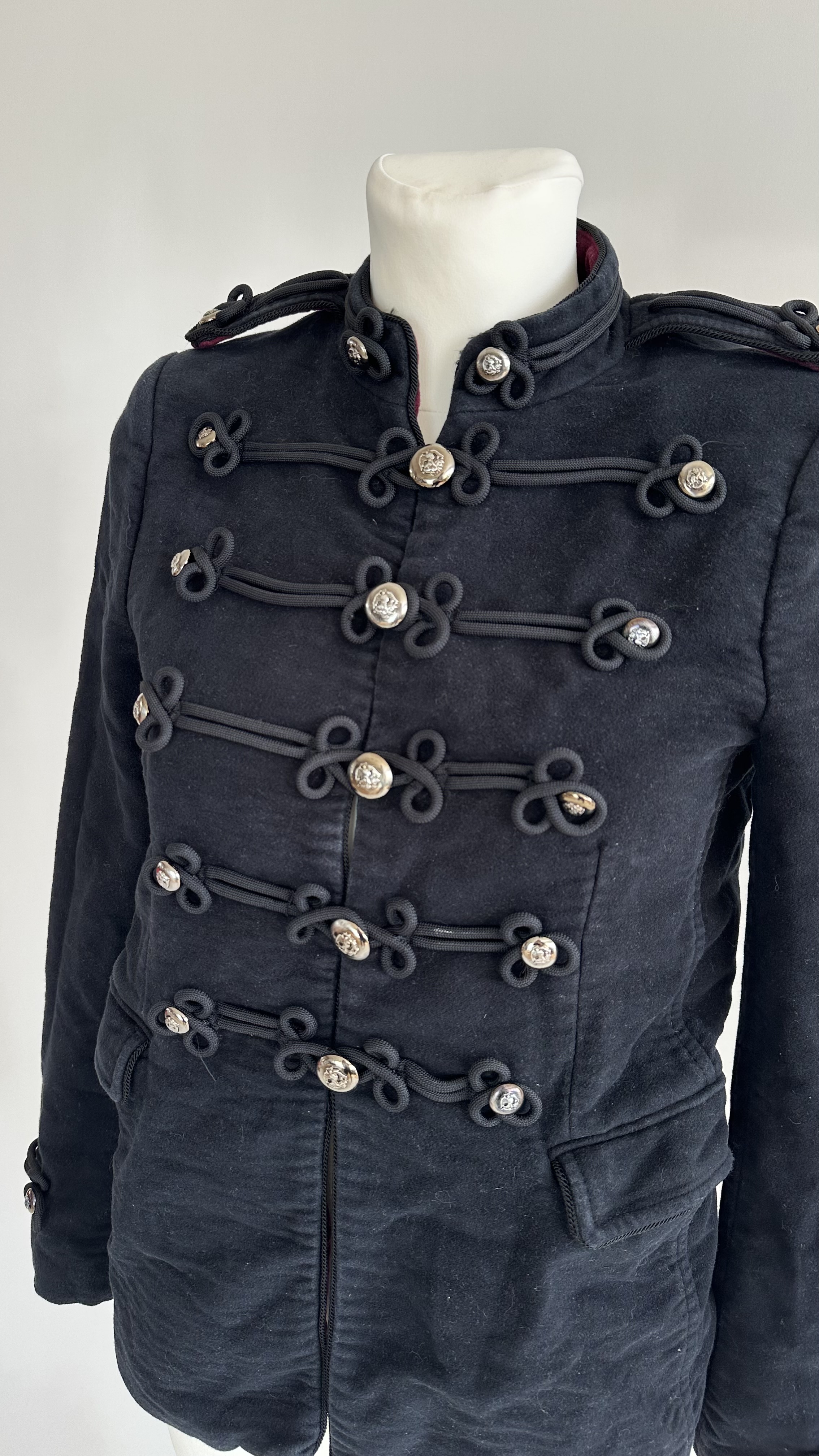 A striking, military-inspired Napoleon jacket in size S by Zara, designed with a strong yet refined silhouette. Featuring a high stand collar, signature braided detailing across the front, and decorative metallic buttons that emphasize its iconic Napoleon style. The tailored cut shapes the waist beautifully while maintaining structure and comfort.
