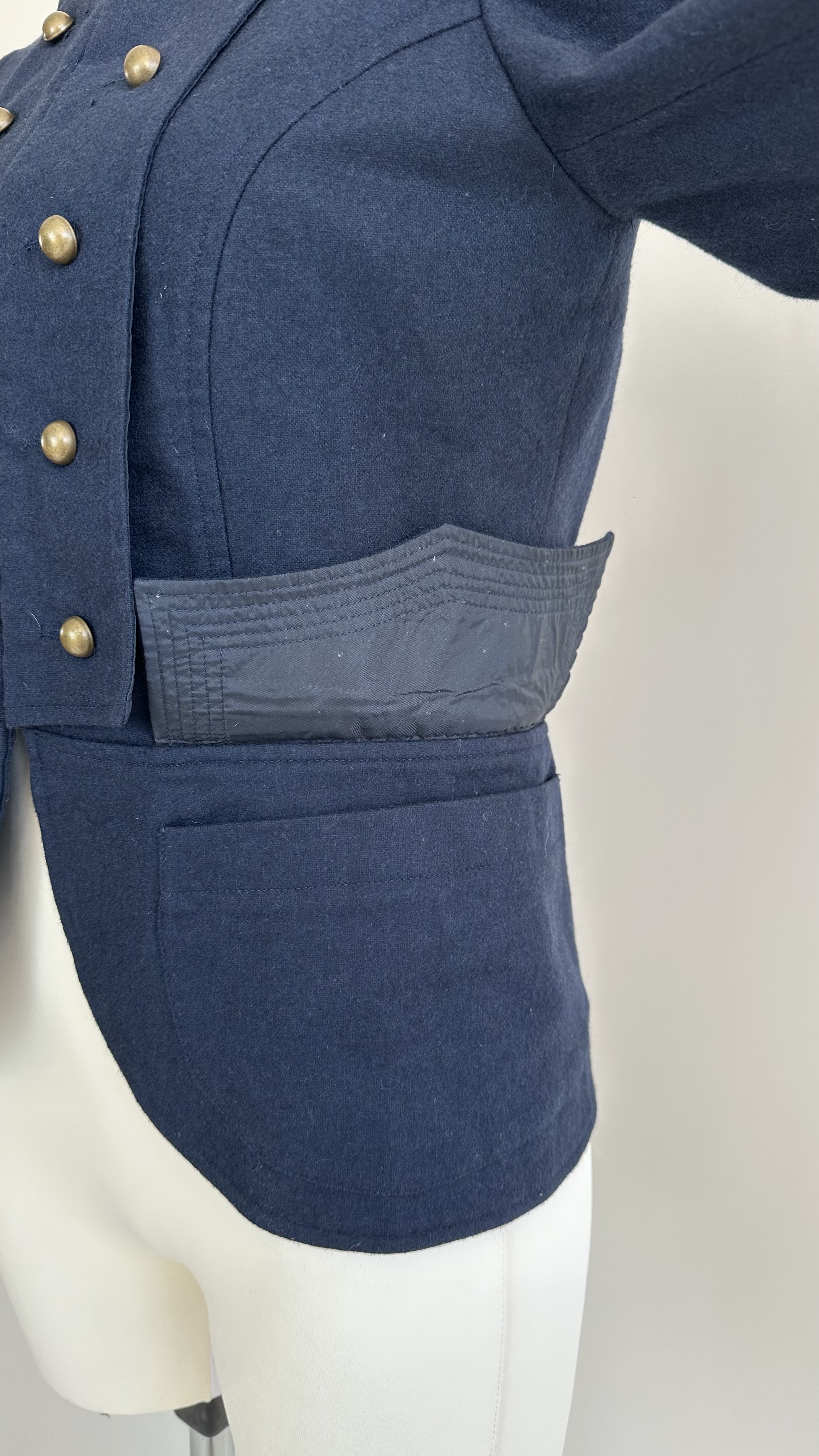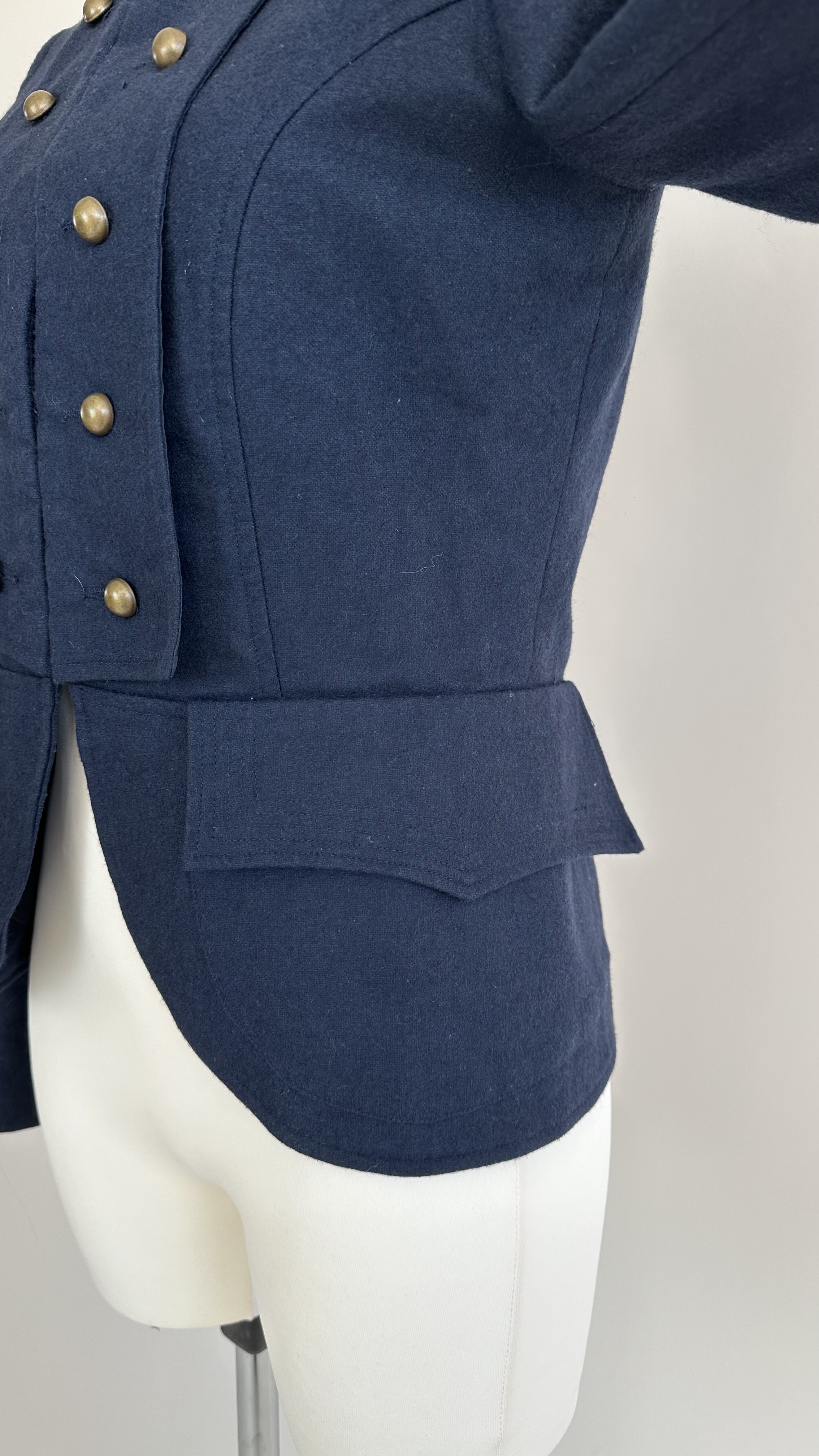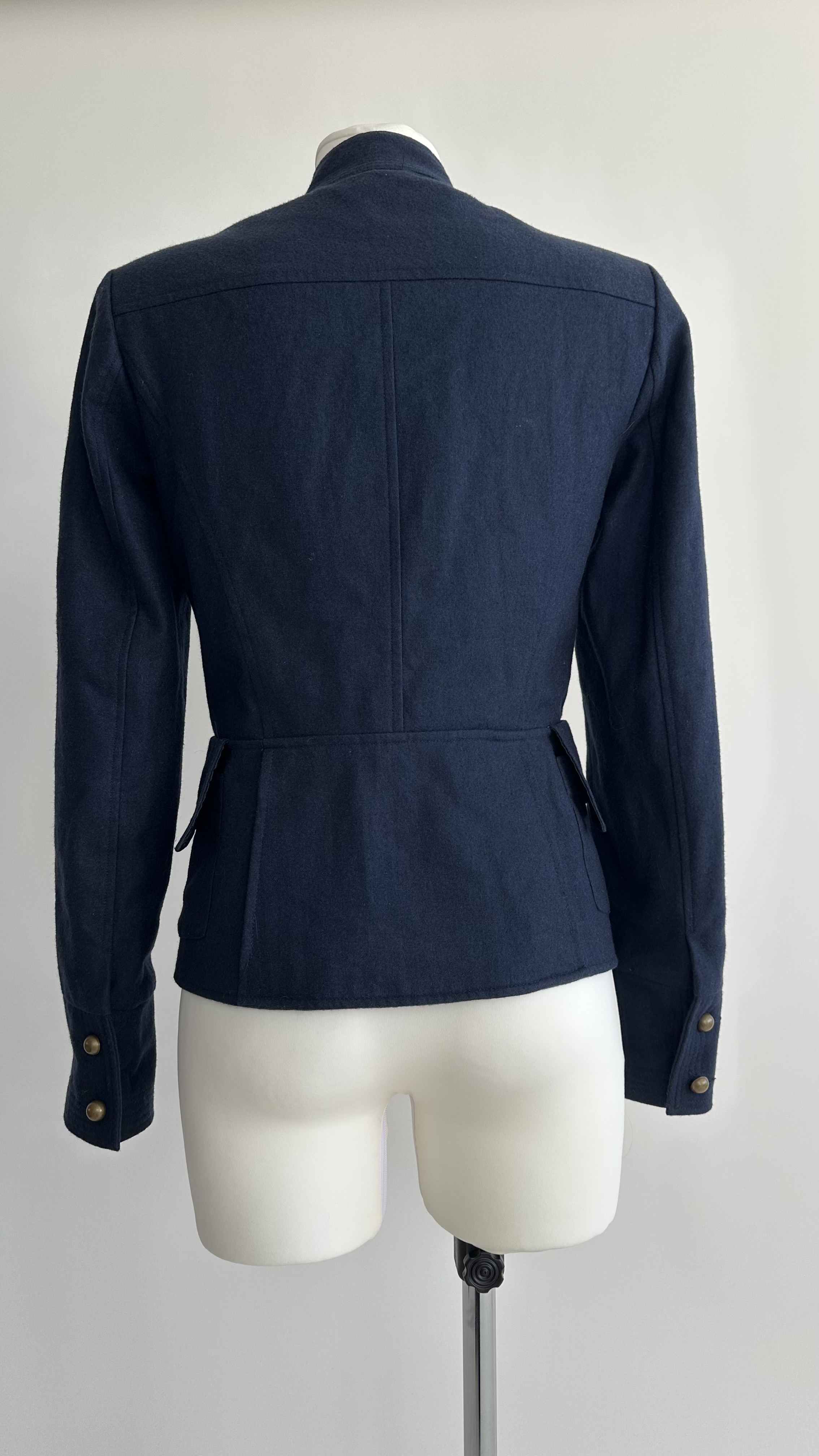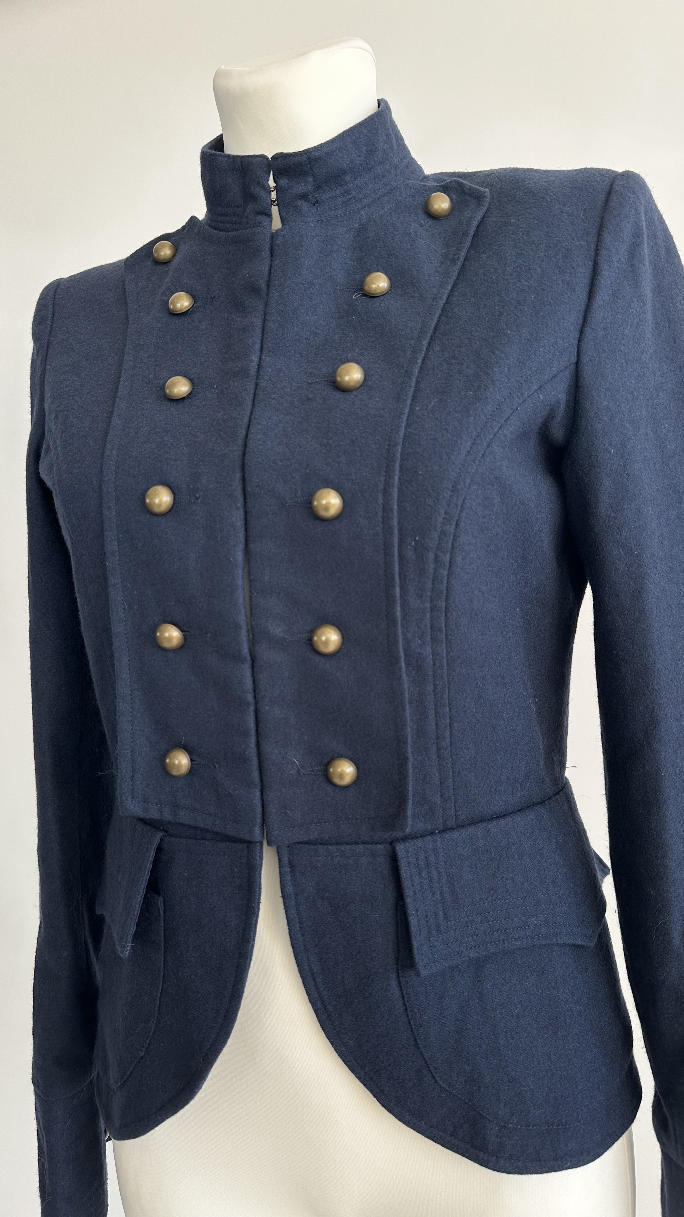Elegant Napoleon jacket by Vero Moda in size S. Tailored, structured silhouette with a high collar and classic double-breasted military-style buttons. Deep navy blue color with subtle brass-tone details creates a timeless, refined look inspired by historical military fashion.