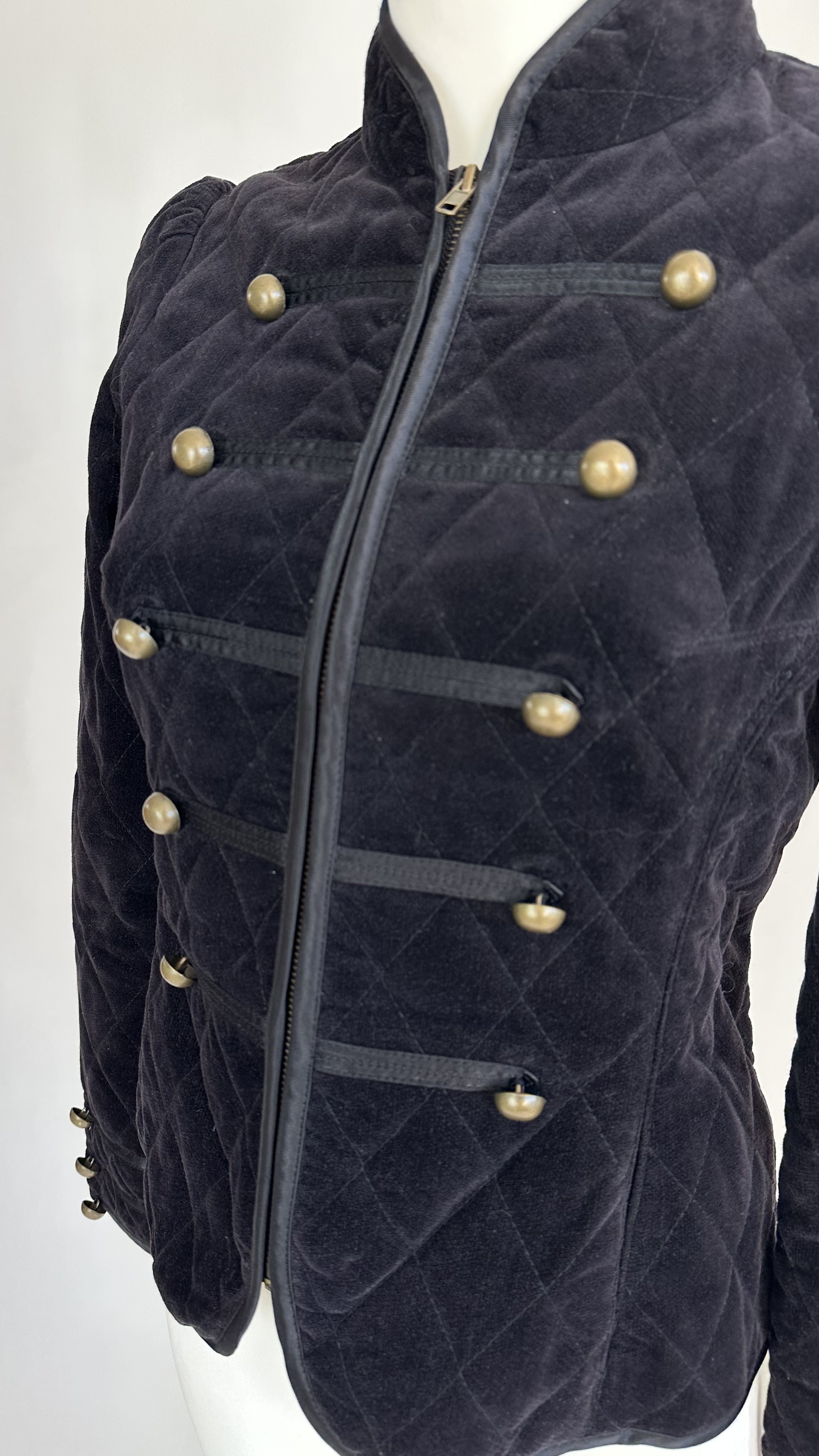 A timeless Napoleon jacket with a strong military-inspired silhouette by Obey. Crafted from 100% cotton, this structured piece features a fitted cut that subtly accentuates the waist while maintaining a sharp, tailored appearance. The diamond quilting adds depth and texture, while the decorative brass-tone buttons and banded detailing on the front and cuffs are classic elements of the Napoleon jacket aesthetic.
