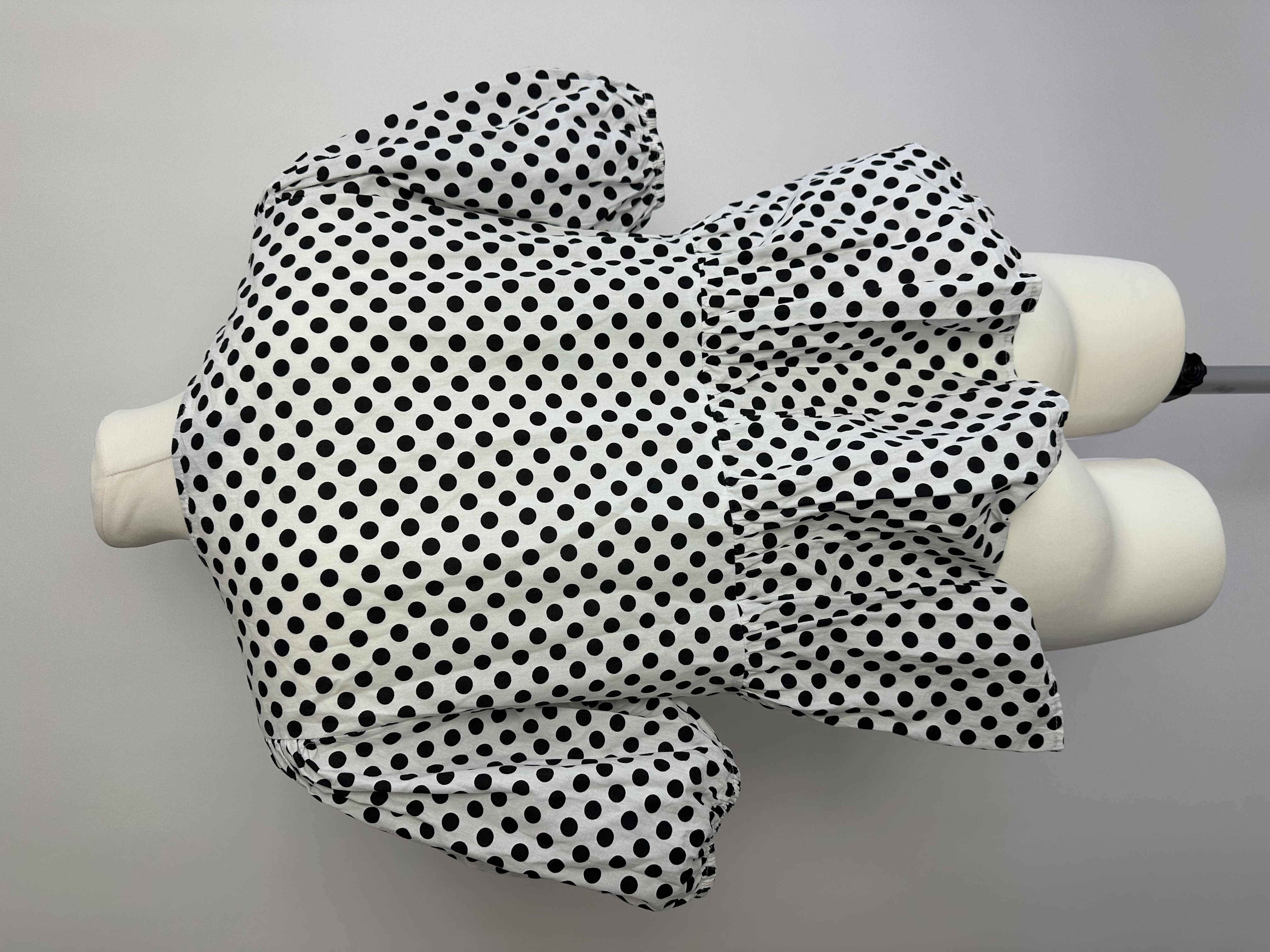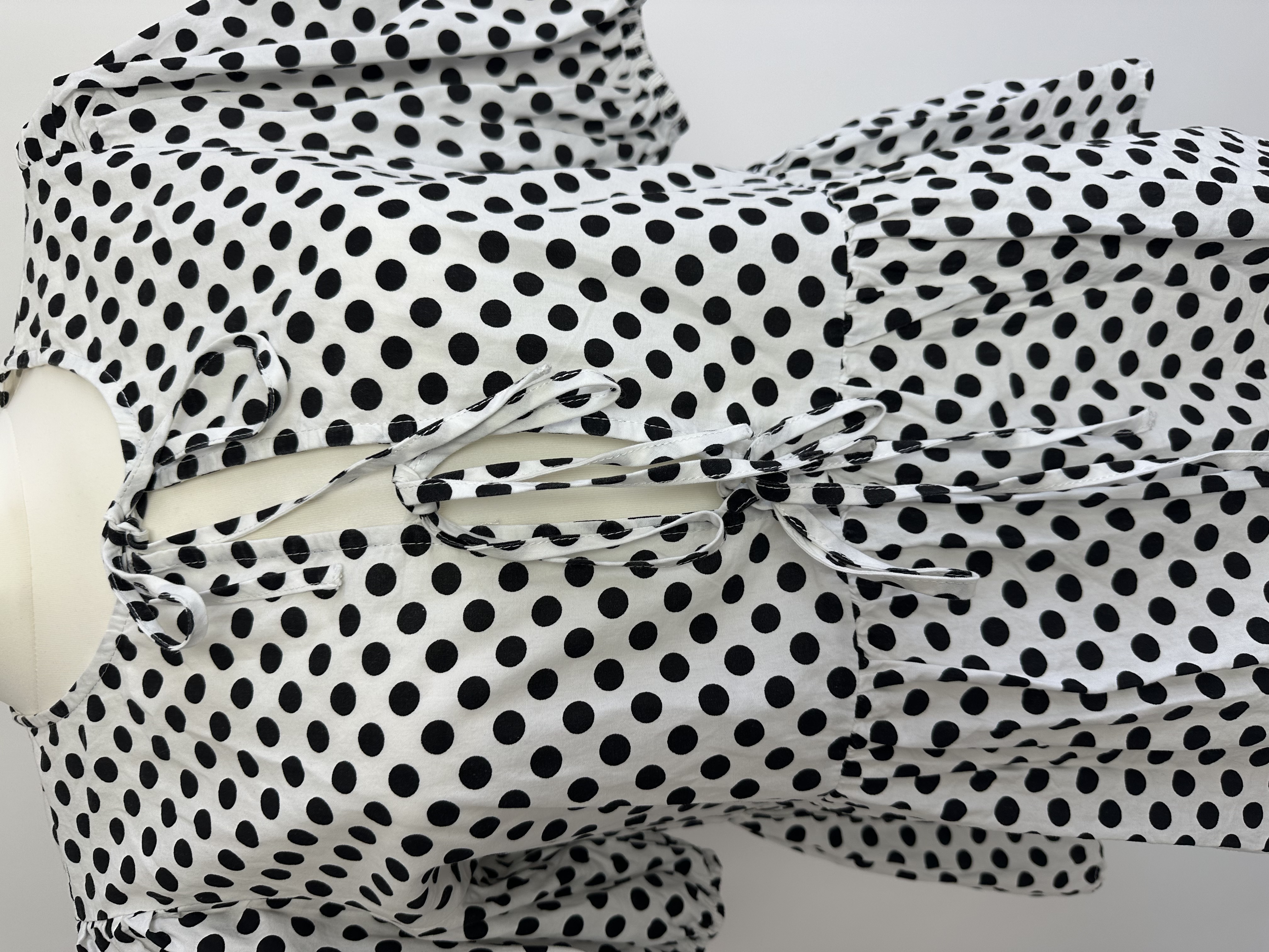 White and black polka dot blouse from PIECES, size M. Features puff sleeves, peplum hem, and a unique triple tie-front detail for a playful, boho-inspired look. Light, airy, and perfect for spring or summer styling.